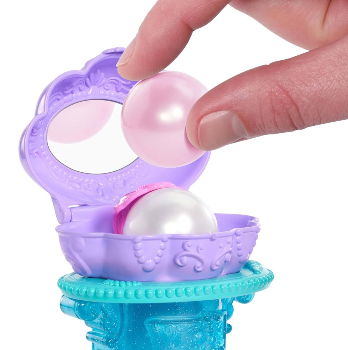 Printre accesoriile surpriză se numără o tiară, un colier și un castron de păr Dinglehopper, perfecte pentru a coafa păpușa Ariel pentru aventuri pe uscat și pe mare.