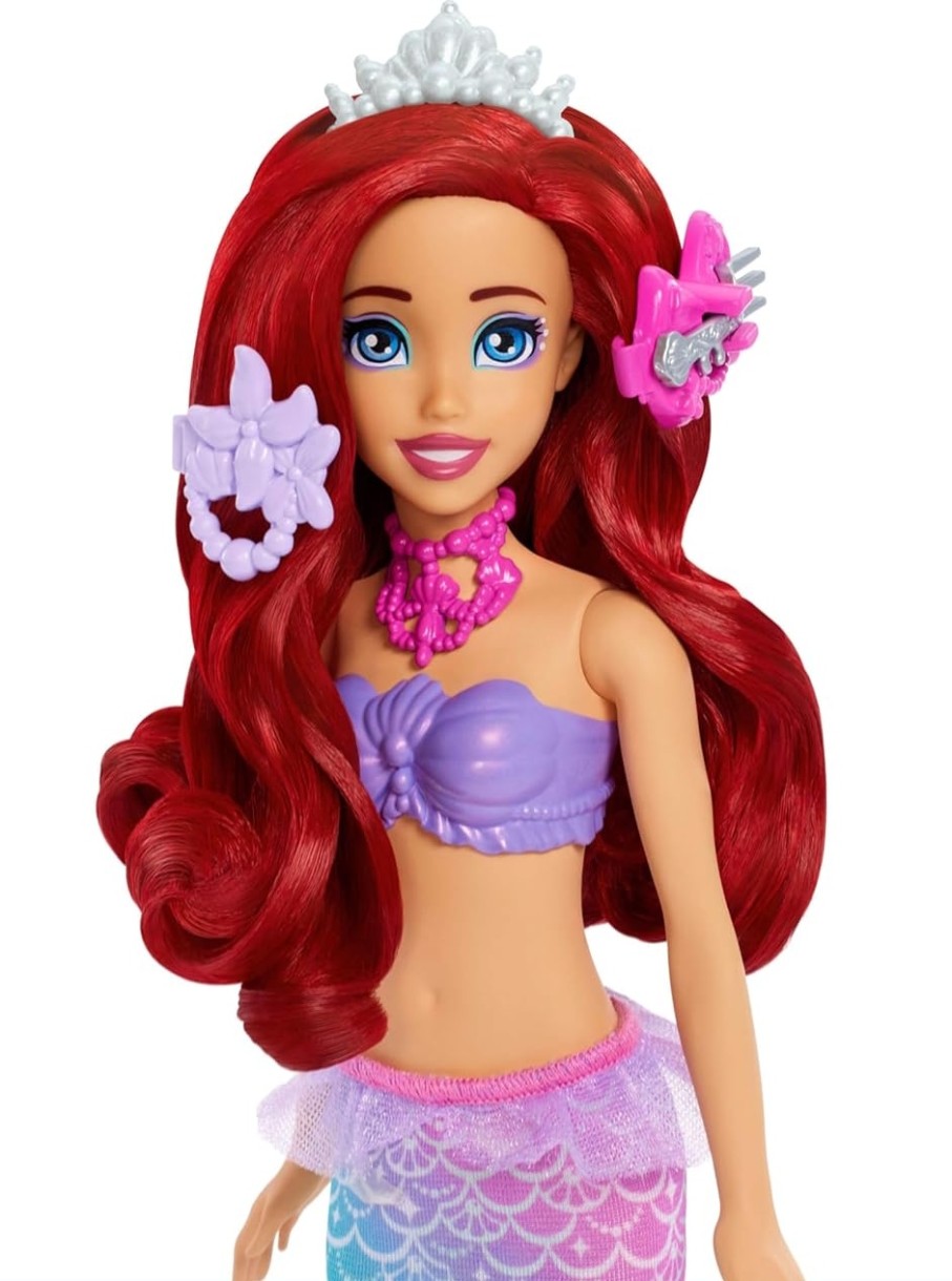 Inspirată de îndrăgitul personaj Disney, păpușa Ariel poartă o coadă de sirenă moale, detașabilă și are păr care poate fi periat pentru distracție în coafare.
