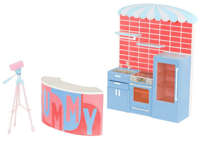 Setul include o bucătărie detaliată, care vine cu un blat, cuptor, vitrină, frigider și chiar o cameră video cu trepied pentru a crea un vlog de gătit autentic. Este compatibil cu majoritatea păpușilor și accesoriilor de 14 inch.