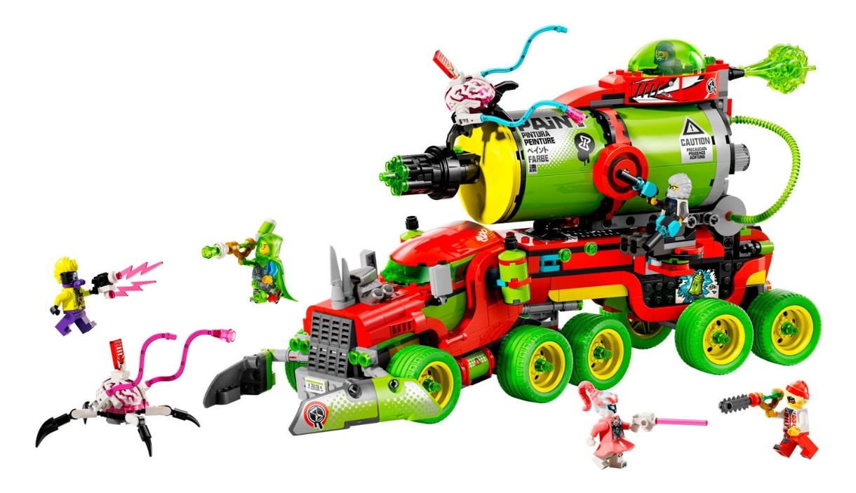 Fanii LEGO DREAMZzz se vor distra de minune construind camionul de jucărie înainte de a alege să-l construiască cu recipientul gigantic cu vopsea spray sau cu lansatorul de rachete cu vopsea. Detaliile interesante includ lansatoare, o cabină de pilotaj care se deschide și lansatoare modulare și recipiente cu spray care sunt compatibile cu alte seturi din linia LEGO DREAMZzz 2025 (vândute separat). Setul îi include, de asemenea, pe Mateo, Cooper, Mr. Oz, Albert, Odin, D-Shock și 2 Creiere-Păianjen Cibernetice pentru a inspira jocul de rol imaginativ.