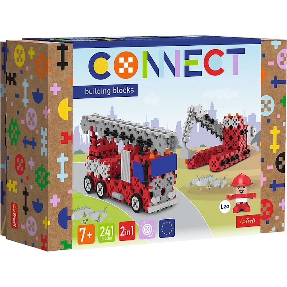 Descoperă lumea creativității cu setul Connect 2 in 1 Fire Brigade / Crawler Excavator, care permite construirea a două modele diferite: o mașină de pompieri de 27 cm și un excavator pe șenile (înălțime 16,5 cm, lungime 21 cm).