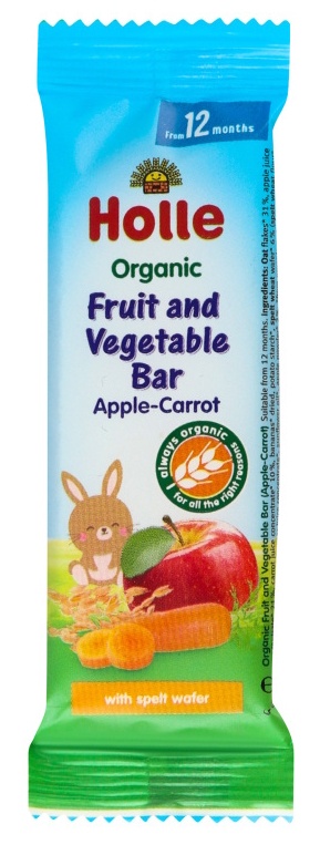 Batonul ecologic cu fructe și legume, de la Holle, este potrivit că gustare pentru copii cu vârstă mai mare de 12 luni. Este practic, ușor de ținut în mâna iar datorită napolitanei subțiri din grâu spelta, mânuțele copiilor nu vor deveni lipicioase.