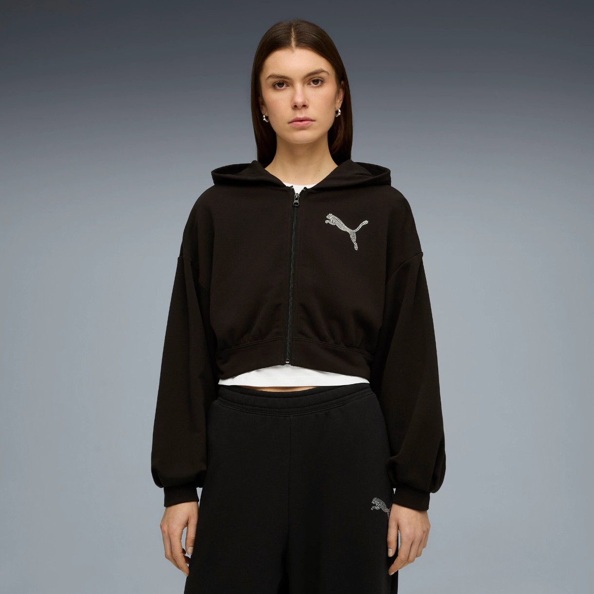 Hanoracul pentru femei Puma Ess Graphics Bedazzled atrage atenția prin designul său modern și vibrant, combinând stilul sportiv cu strasuri pe piept și un logo imens conturat PUMA pe spate.