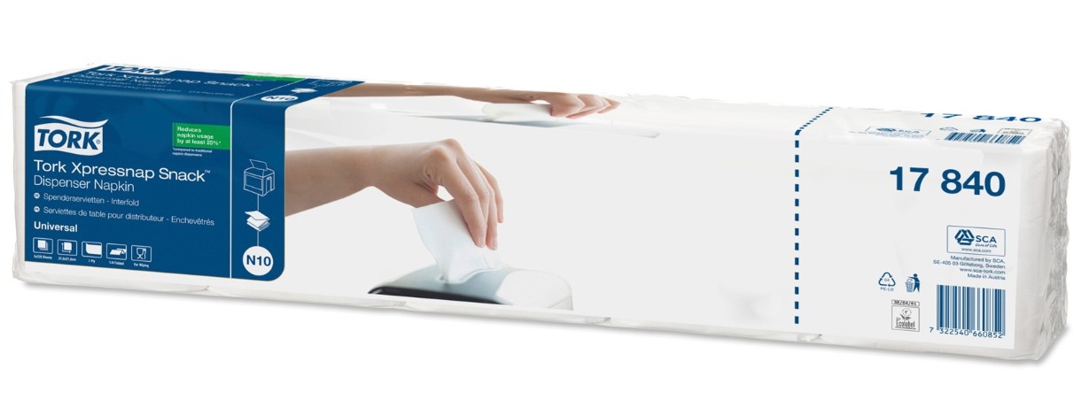 Dozatoarele de șervețele de masă Tork Xpressnap Snack® au fost concepute pentru restaurantele cu autoservire, unde un șervețel mic este suficient. Sistemul vă va ajuta să reduceți consumul de șervețele de masă cu 25% comparativ cu dozatoarele tradiționale de șervețele. Șervețelele de Masă pentru Dozator Tork Xpressnap Snack® Albe, într-un singur strat sunt ideale pentru unitățile care pun accent pe confort, costul în utilizare și care servesc gustări, băuturi și porții mai mici de mâncare.