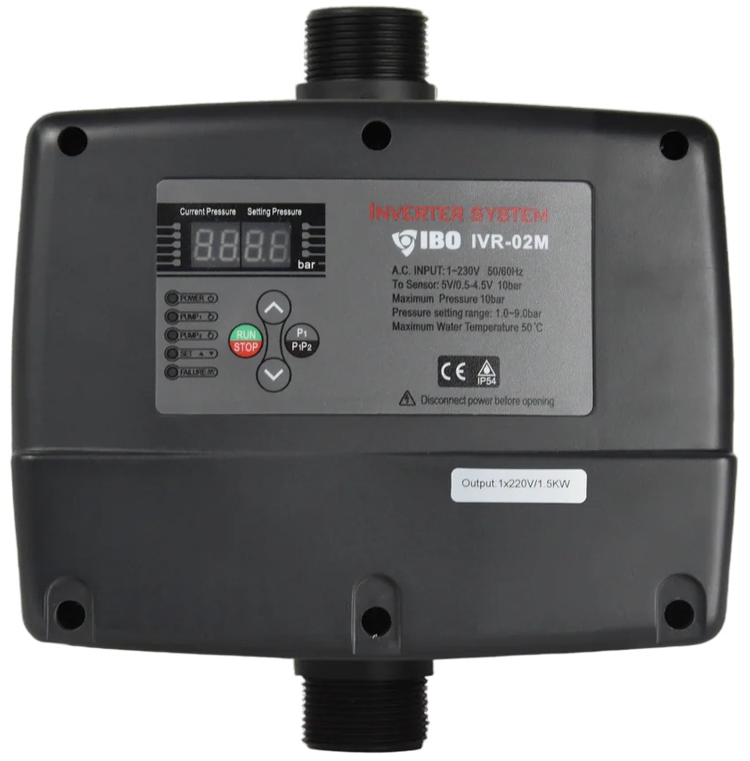 Controlerul inteligent de pompe IVR 02M (0,37–1,5 kW, 230 V, 12 A) este un dispozitiv de control și protecție pentru conectarea directă a pompelor monofazate submersibile, de suprafață și alte tipuri de pompe cu puteri între 0,37 și 1,5 kW (0,5–2 HP). Controlerul menține presiunea constantă a apei prin reglarea vitezei motorului pompei în funcție de cerințele sistemului. Utilizarea unui invertor permite economii de energie de 30–60 % comparativ cu metodele tradiționale. Funcția Soft-Start și oprirea lină previn șocurile hidraulice cauzate de porniri sau opriri bruște ale fluxului de apă. Dispozitivul oferă protecție completă împotriva supratensiunii, subtensiunii, scurtcircuitului, blocării rotorului și funcționării pe uscat fără necesitatea instalării senzorilor în puț. IVR 02M permite, de asemenea, controlul a două pompe care alimentează sistemul, asigurând funcționare fiabilă și eficientă, cu posibilitate de rezervare sau operare secvențială a pompelor.