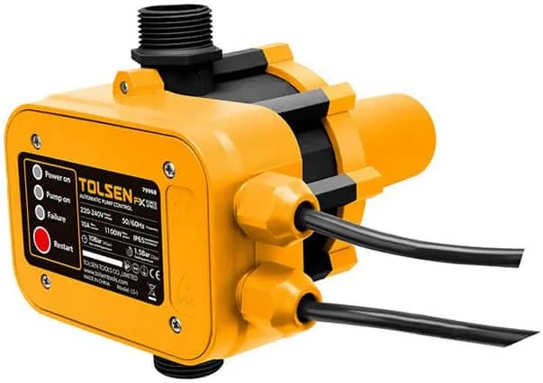 TOLSEN 1100W AUTOMATIC PUMP CONTROL — dispozitiv fiabil pentru controlul automat al pompelor, asigurând o presiune constantă în sistemul de alimentare cu apă. Are protecție la suprasarcină și certificare CE. Cu o putere de 1100 W și presiune maximă de lucru de 10 bar, este ideal pentru utilizare domestică și în grădină. Funcționează la tensiunea de 220–240 V și frecvența de 50/60 Hz, cu un curent maxim de 10 A. Presiunea de pornire este 1,5 bar, iar diametrul conexiunilor este 1″ × 1″. Gradul de protecție IP65 asigură rezistență la umiditate și praf.