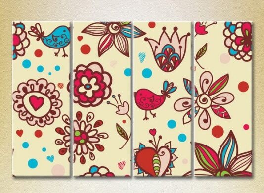 Pictură Rainbow Polyptych Texture burgundy flowers and birds 01 (2230622)