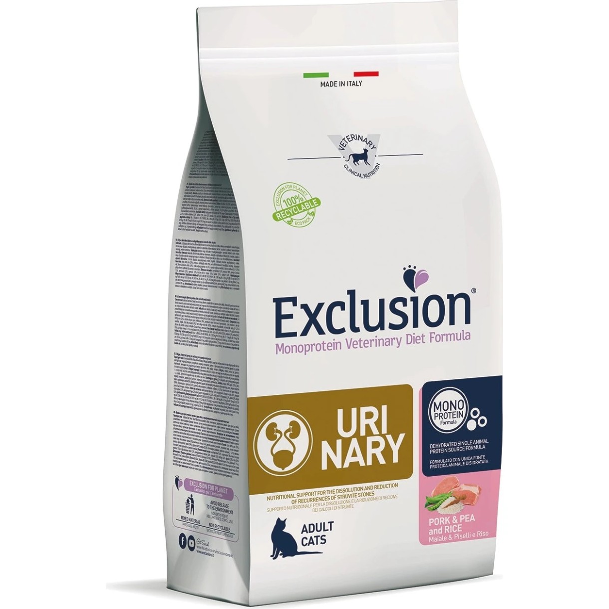 Exclusion Monoprotein Veterinary Diet Formula Urinary este un aliment veterinar complet pentru pisicile adulte, conceput pentru a dizolva calculii de struvit și a reduce recurența acestora. Acest aliment dietetic are proprietăți de acidifiere a urinei și conține niveluri scăzute de magneziu.