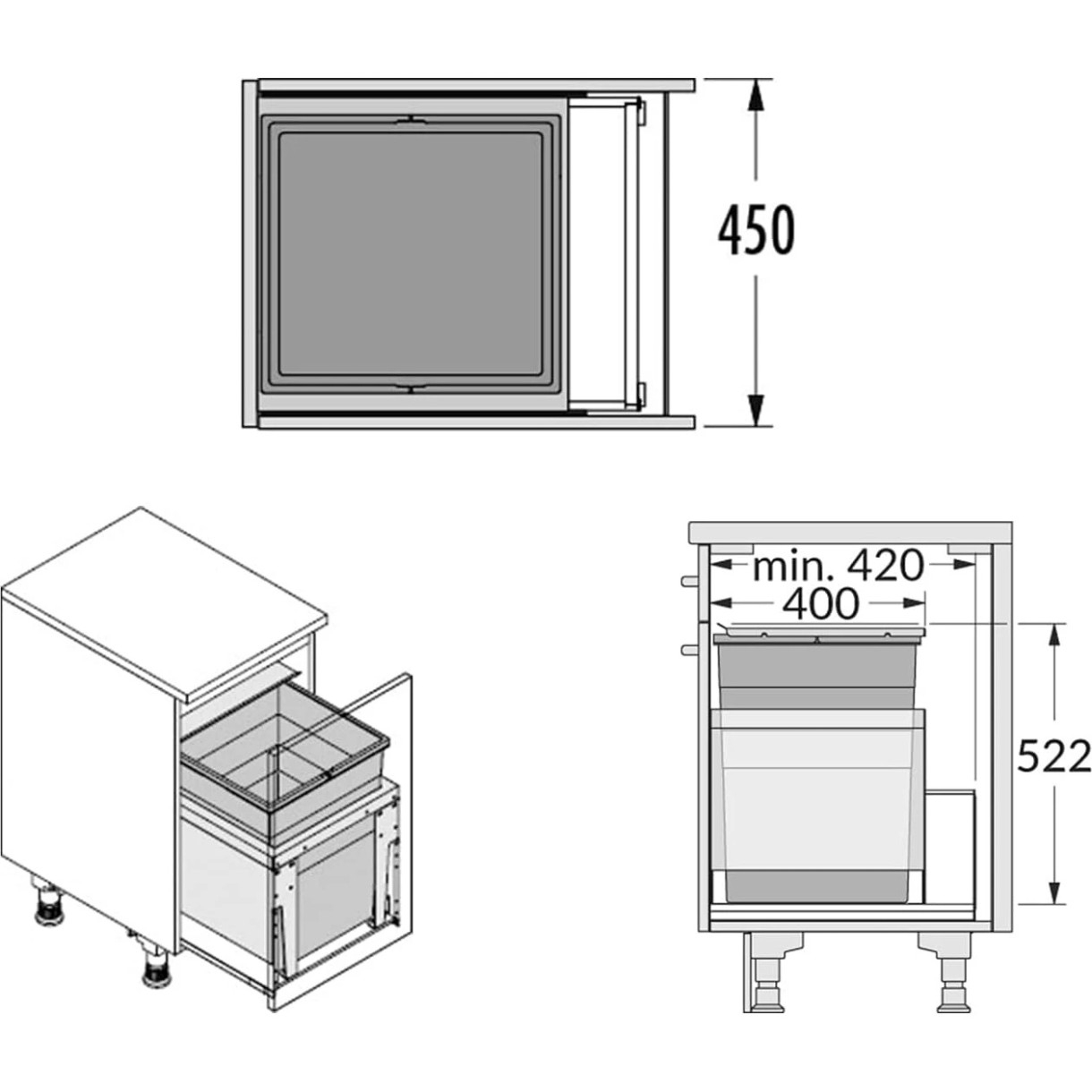 Construcția prevede mai multe recipiente, care permit sortarea comodă a diferitelor tipuri de deșeuri. Carcasa dreptunghiulară este adaptată optim pentru montarea într-un sertar cu lățimea de 450 mm, asigurând stabilitate și o utilizare confortabilă.