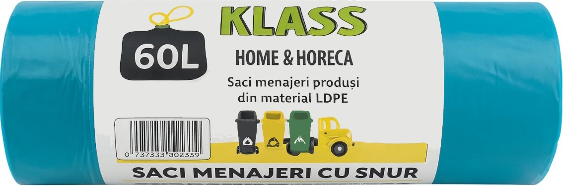 Saci menajeri KLASS, turcoaz, cu șnur, capacitate 60 L, 10 bucăți/rolă sunt saci de gunoi versatili și rezistenți, potriviți pentru colectarea eficientă a deșeurilor în locuințe, birouri sau spații comerciale. Fabricate din material durabil, acești saci oferă o soluție igienică și comodă pentru gestionarea resturilor menajere. Șnurul integrat permite închiderea rapidă și sigură a sacilor, pentru un transport curat și fără murdărie. Culoarea turcoaz îi face ușor de diferențiat și poate susține sistemele de sortare a deșeurilor. Ideali pentru coșuri mai mari sau suprafețe unde se generează mai mult gunoi.