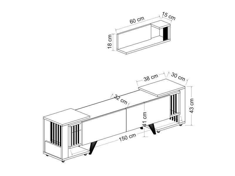 Cu dimensiunile de 30 cm lățime, 41 cm înălțime și 150 cm lungime, unitatea pune la dispoziție spațiu generos pentru televizor, dispozitive media și diverse accesorii. Compartimentarea bine gândită permite organizarea eficientă a tuturor elementelor necesare.