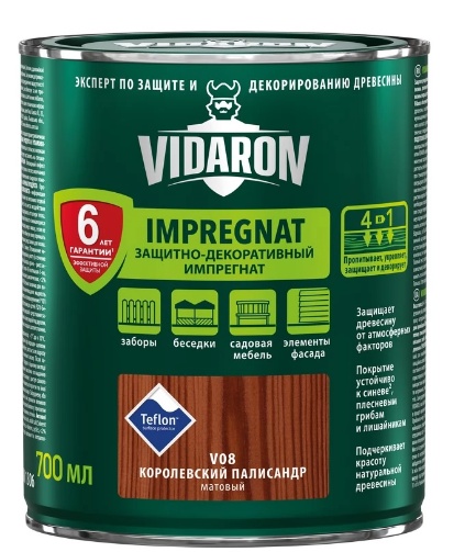 Impregnant modern pentru protecția și decorarea lemnului situat atât la exterior cât și în interiorul încăperilor. Produsul este destinat impregnării lemnului folosit în interiorul și exteriorul încăperilor. Protejează lemnul împotriva condiţiilor atmosferice severe, formând pe suprafața lemnului o peliculă rezistentă la biocoroziune (pete albastre, ciuperci de mucegai). Aplicat împreună cu Impregnantul Protectiv VIDARON (incolor),asigură o protecție completă lemnului.