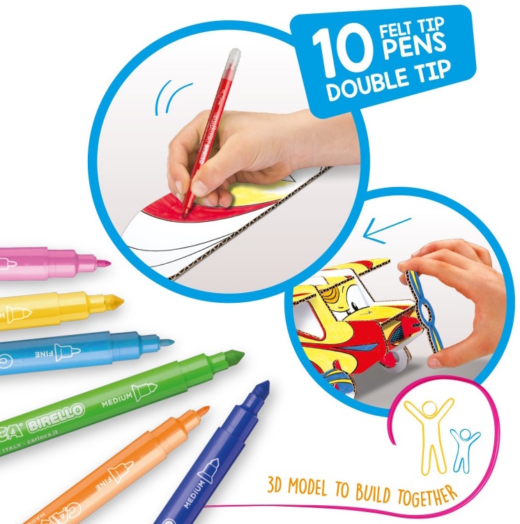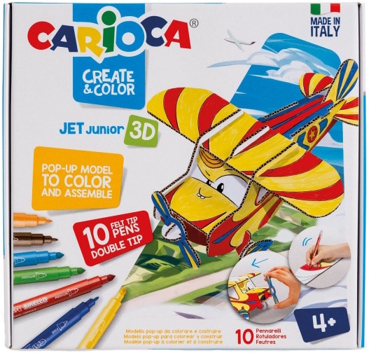 Setul creativ Carioca Create & Color Jet Junior 3D oferă copiilor o activitate distractivă și educativă care combină asamblarea unui model tridimensional cu coloratul, stimulând imaginația și îndemânarea. Copiii construiesc un avion 3D din piese pop-up, apoi îl colorează cu markere duble (fine și medii) incluse în pachet, special concepute să se spele ușor, oferind libertate de creație fără griji. Materialele sunt sigure, iar setul este potrivit pentru activități de joacă acasă sau ca proiect creativ în familie.