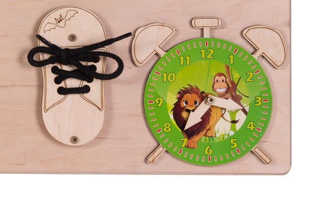 Tabla de dezvoltare include:- stele mobile multicolore; - Închidere cu fermoar; - clopot pentru biciclete; - trei tipuri de zăvoare; - pantofi cu șiret (Învățarea de a lega șireturile); - camere din lemn; - litere din lemn multicolore; - role mobile și pivotante;