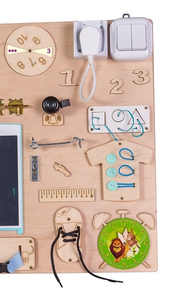 Velcro; - labirint cu un rechin în mișcare; - tablă în formă de navă pentru scris cu cretă; - cârlig pentru încuietoare; - oglindă de rupere în formă de rachetă; - ceas cu mâinile mișcate; - sortator cu 3 forme; - rigla; - intrerupator; - zâmbitoare; - lacăt cu chei; - cerc mobil cu numere; - priza cu mufa; - cămașă cu nasturi; - curea cu cataramă Cârlige incluse (pentru montare pe perete).