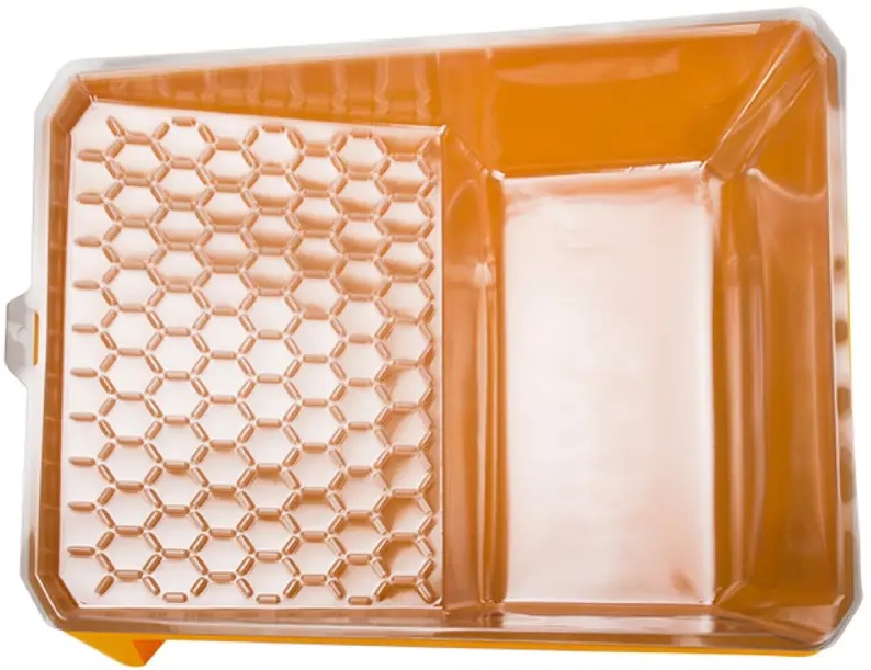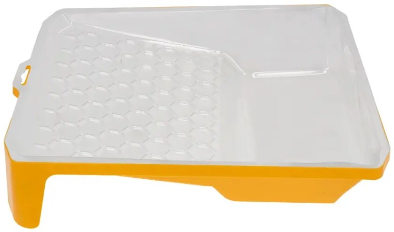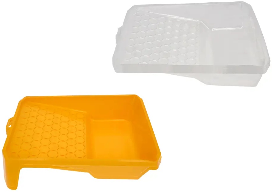 Set de vopsit HARDY nr. 4. Forma unică a tăvii de vopsit este concepută pentru a asigura o acoperire maximă și o distribuție uniformă a vopselei pe suprafața rolei. Se curăță ușor de vopseaua veche. Setul conține, de asemenea, cinci inserții de rezervă pentru tavă. Cuveta rezistă cu ușurință la utilizarea intensivă, deoarece este fabricată din plastic rezistent la impact și la solvenți. Dimensiunea mare și forma convenabilă accelerează semnificativ lucrările de vopsire. Acest instrument auxiliar simplu permite aplicarea precisă a vopselelor pe suprafață, protejându-vă complet de scurgeri și pete neplăcute. Pentru o consum economică a vopselelor și distribuirea uniformă a acestora pe rolă, este prevăzută o platformă striată.