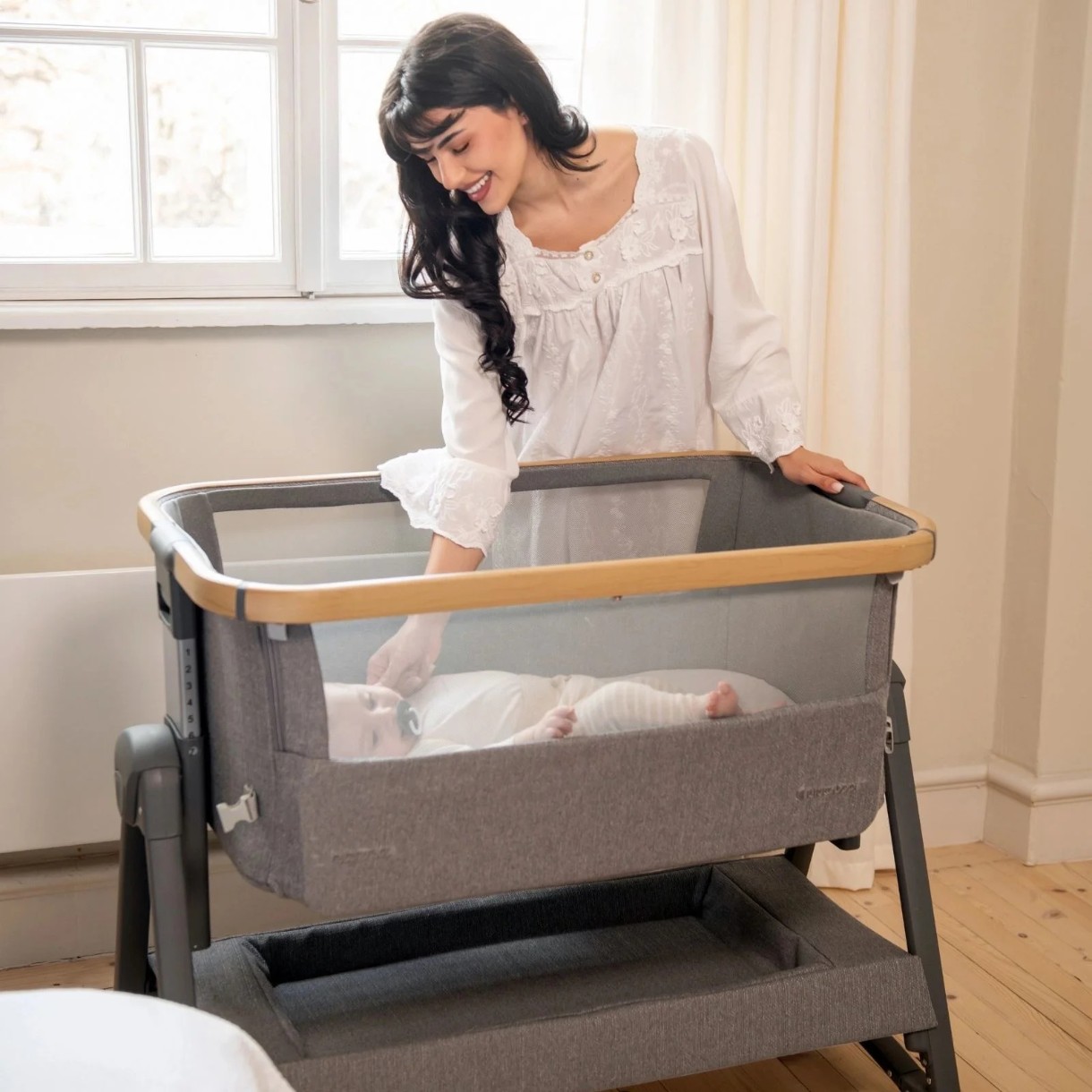 NANNA 2 este un pătuț modern, conceput pentru a asigura apropierea dintre părinți și bebeluș în timpul somnului, oferind totodată funcționalitate și un design plăcut.