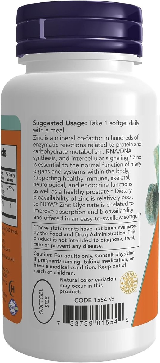 Zincul este esențial pentru câteva sute de reacții enzimatice asociate cu metabolismul proteinelor și carbohidraților, sinteza ARN și ADN-ului și semnalizarea de la celulă la celulă. Zincul este vital pentru funcționarea normală a multor organe și sisteme ale corpului, susține sănătatea sistemului imunitar, osos, nervos și endocrin al organismului, precum și pentru sănătatea glandei prostatei. Zincul alimentar are o biodisponibilitate relativ scăzută, motiv pentru care Now Zinc Glycinate este chelat pentru a îmbunătăți absorbția și biodisponibilitatea și vine în capsule ușor de înghițit.