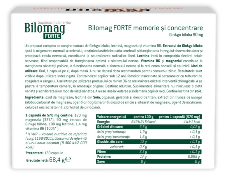 1 capsula de 570 mg conține: 120 mg magneziu (32%*), 90 mg extract de Ginkgo biloba, 100 mg lecitina, 1,4 vitamina B6 (100%*)