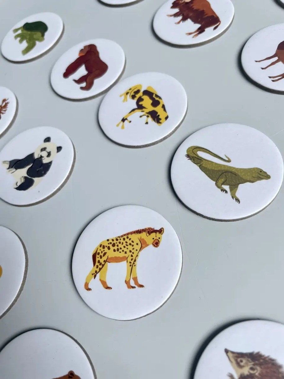 In set6 cărți rotunde cu continente, 6 table de loto, 42 de jetoane rotunde cu animale, 1 pungă de pânză