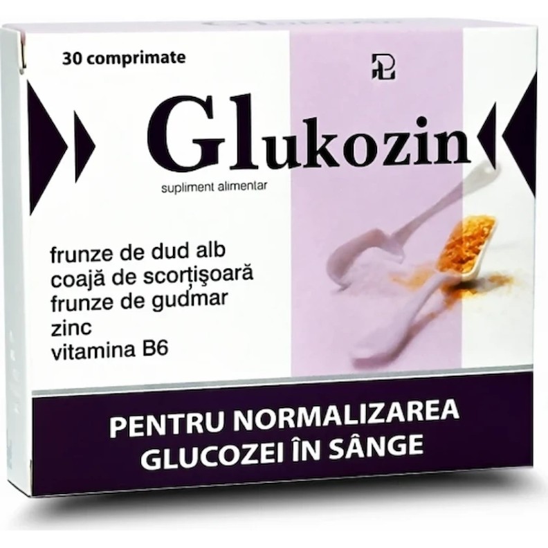 ACŢIUNEA INGREDIENTELOR: Glucozin este un supliment alimentar, sursă de zinc, vitamina B6, extract de frunze de Dud Alb, scorţişoară şi frunze de Gudmar. Zincul ce se conţine în formula preparatului, ajută la menţinerea metabolismului glucidic. Vitamina B6 contribuie la menţinerea metabolismului proteinic şi glicogenic corect şi la controlul activităţii hormonale, în plus, ajută şi la activitatea corectă a metabolismului homocisteinei, creşterea nivelului căreia se consideră că duce la dezvoltarea diferitor boli. Substanţele active din extractele vegetale, ce se conţin în preparat, ajută la menţinerea normală a cantităţii de glucoză în sânge.