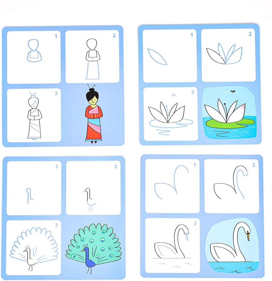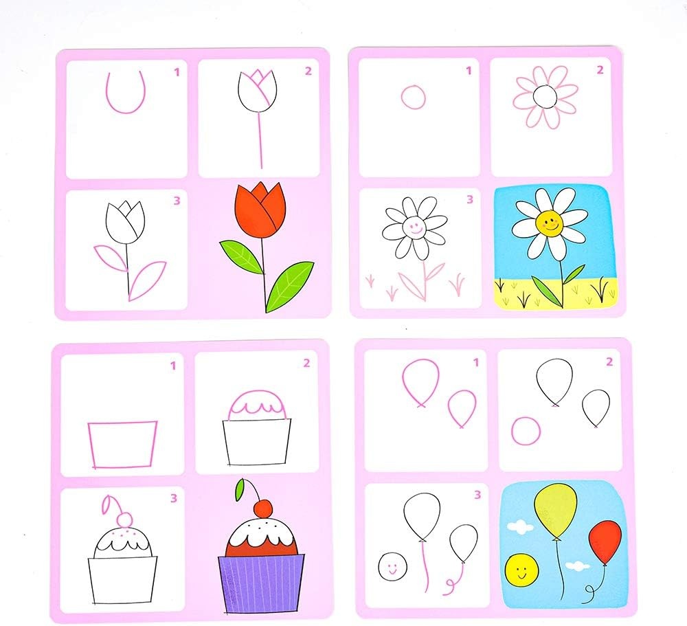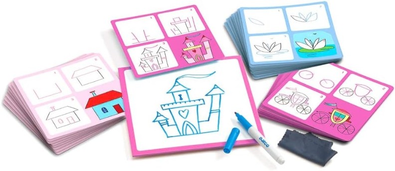 In set24 de carduri cu instrucțiuni pas cu pas, planșetă de desen, 1 marker, o bucată de material pentru a șterge imaginea