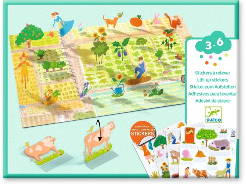 Djeco Lift‑up Stickers (DJ00045) este un set creativ cu stickere reutilizabile care îi permite copilului să construiască scene 3D distractive din lumea fermei. Stickerele se aplică pe fundaluri mari și apoi se ridică unul câte unul pentru a crea efecte tridimensionale care transformă fiecare imagine într‑o poveste viu colorată. Setul include aproximativ 80 de stickere reutilizabile și 4 scene ilustrate, oferind ore întregi de joacă imaginativă și dezvoltare a creativității și motricității fine. Materialele sunt realizate din hârtie și carton cu certificare FSC®, iar scenariile pot fi refăcute iar și iar, deoarece stickerele sunt repozitionabile.