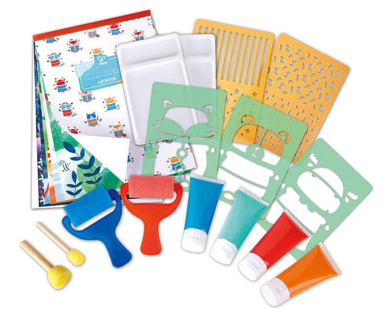 In set4 tuburi de vopsea de 2 oz, 5 șabloane standard, 2 role de vopsea, 2 perii rotunde cu burete, album de 8 pagini cu 6 activități pentru șevalet Hape