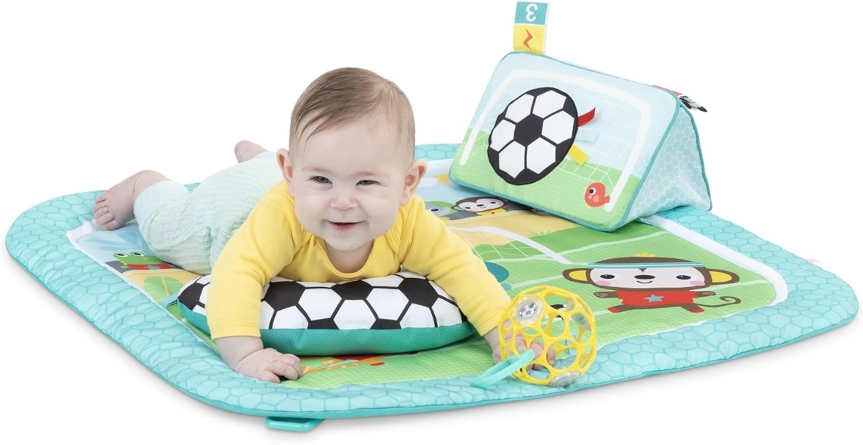 Gata, dați lovitura, MARCAȚI! Aduceți tehnologia Oball, preferată a familiei, pe terenul de fotbal cu sala de activități Bright Starts Grip & Kick Oball. Cu 4 moduri de joc, jucătorul dvs. vedetă se va distra de minune în această sală de joacă. Barele de jucării și activitățile de dezvoltare sunt ușor de rearanjat pentru a fi stat pe burtă, întins și jucat, așezat și jucat sau distracție în mișcare. Salteaua include o pernă de lovitură ultra-reactivă, cu lumini, melodii și sunete de aclamație care recompensează loviturile sau loviturile bebelușului! Păstrați coloana sonoră a timpului de joacă proaspătă și distractivă cu peste 30 de melodii și sunete.