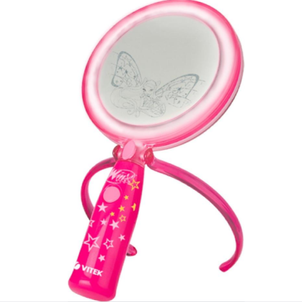 Oglindă dublă Vitek WX-2101 ST într-un design luminos decorat în stilul desenului animat «Winx». Oglinda este echipată cu lumină, precum și un suport pliabil.