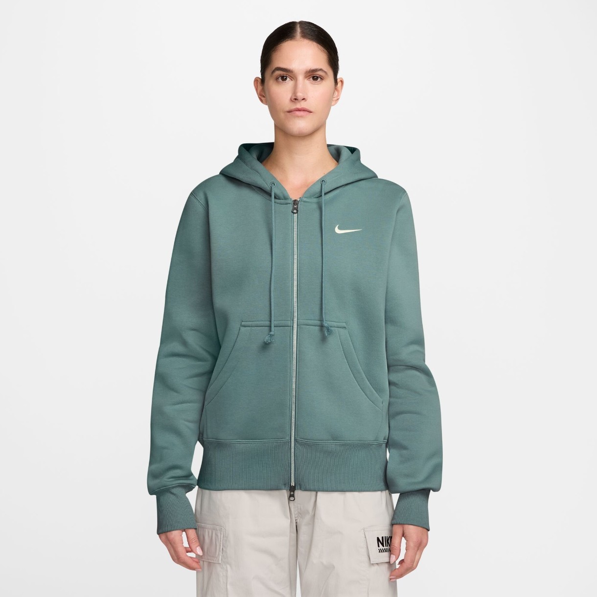 Buzunarele frontale sunt practice și funcționale, ideale pentru a păstra la îndemână obiectele esențiale sau pentru a vă încălzi mâinile în zilele mai răcoroase. Manșetele și tivul cu nervuri fixează delicat produsul și ajută la menținerea formei, conturând o siluetă ordonată, ce se potrivește perfect atât cu joggeri și colanți, cât și cu blugi sau chiar cu o fustă casual. Logo-ul brodat Nike Swoosh de pe piept adaugă accentul final de stil, subliniind caracterul autentic al brandului.