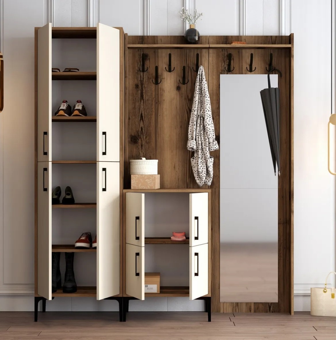 Cu numeroase rafturi și un cuier suspendat, acest suport de hol oferă un spațiu generos pentru depozitarea tuturor lucrurilor esențiale. Paltoanele, pălăriile, gențile și pantofii își găsesc cu ușurință locul, menținând intrarea îngrijită și organizată.