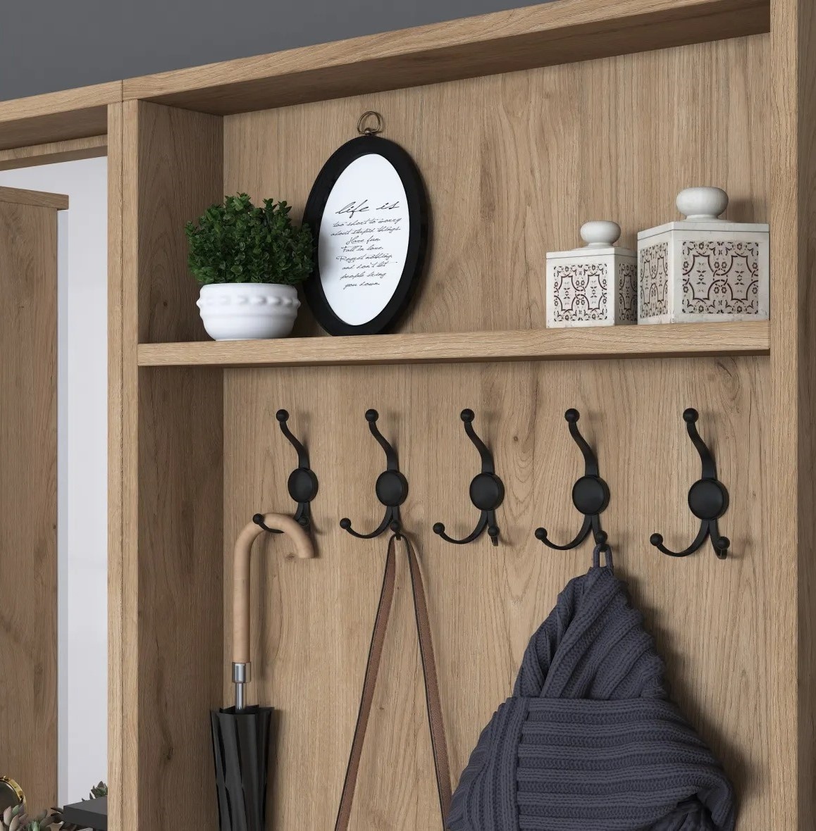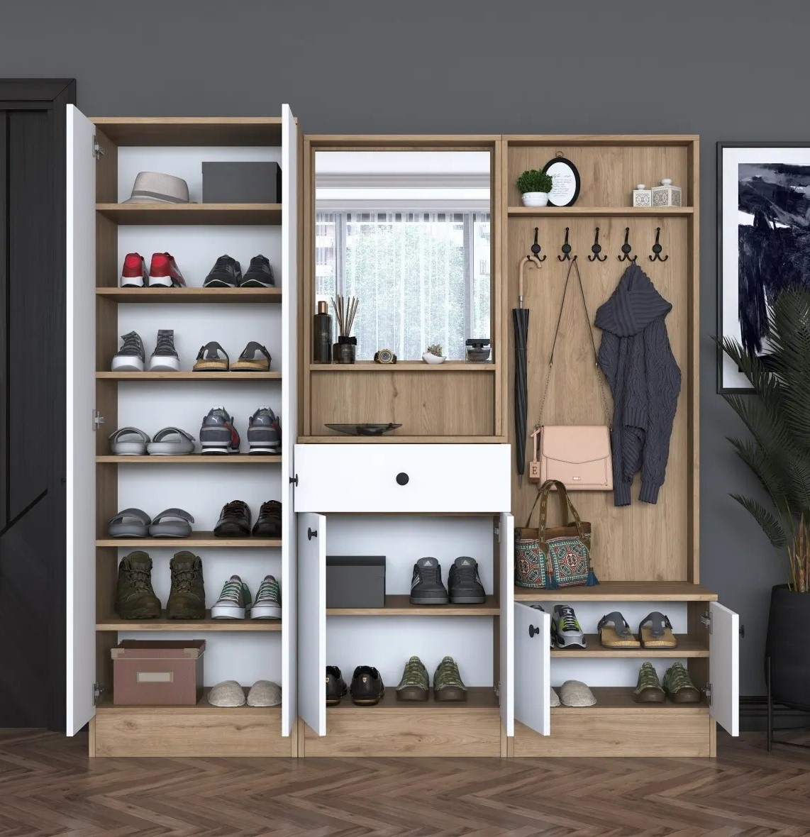 Numeroasele rafturi și compartimente suplimentare oferă suficient spațiu pentru a păstra lucrurile organizate și la îndemână. Puteți depozita pantofi, genți sau obiecte decorative preferate, menținând holul fără dezordine.