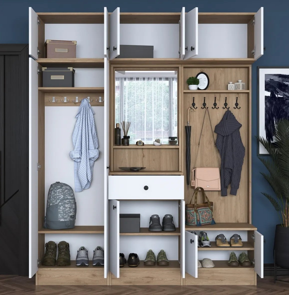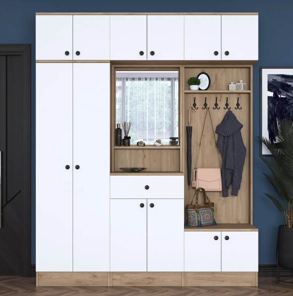 Spuneți adio haosului și întâmpinați organizarea eficientă. Suportul pentru hol oferă numeroase rafturi și compartimente suplimentare, permițând păstrarea pantofilor, genților, cheilor și altor obiecte esențiale în ordine. Totul are locul său desemnat, facilitând dimineți fără stres.