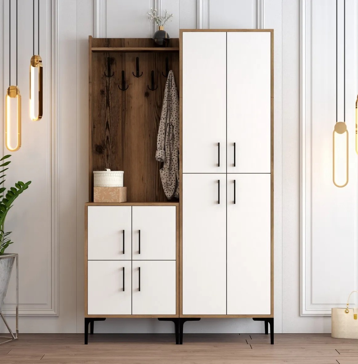 Spuneți adio intrărilor dezordonate și salutați organizarea eficientă. Suportul pentru hol are numeroase rafturi, oferind suficient spațiu pentru paltoane, pălării, genți și alte obiecte esențiale. Totul rămâne la îndemână și aranjat, simplificând rutina zilnică.