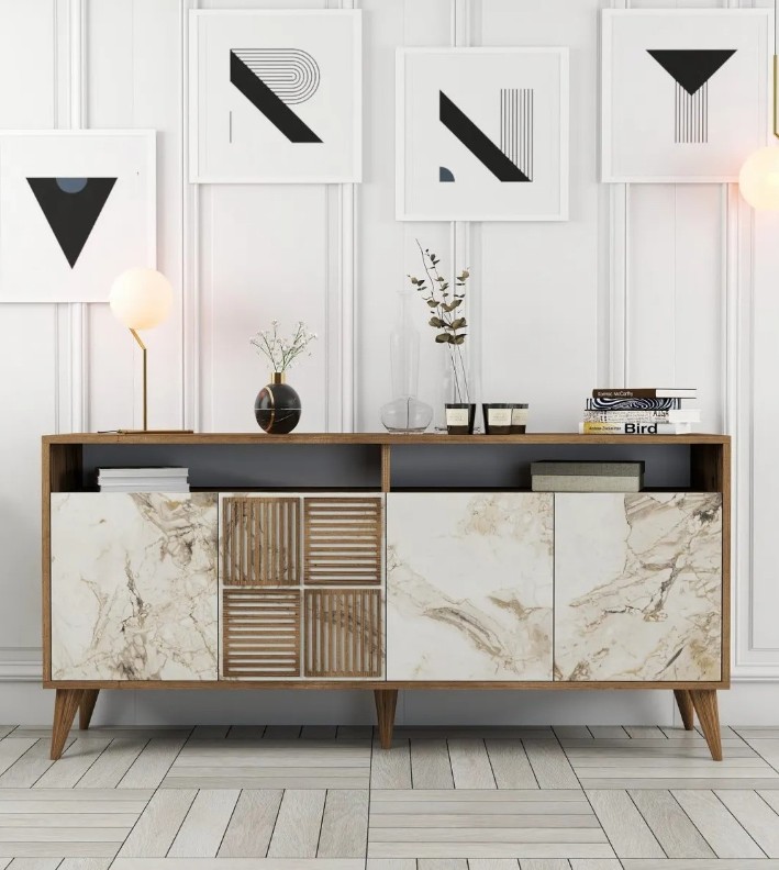 Îmbrățișați noutatea consolei noastre moderne, concepută pentru a vă înălța spațiul de locuit cu farmecul său contemporan. Liniile sale curate și designul minimalist creează un farmec vizual captivant, care cu siguranță vă va impresiona oaspeții.