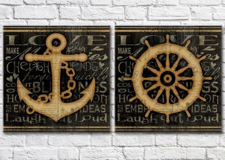 Pictură ArtPoster Anchor and steering wheel on vintage Black background (3453079)