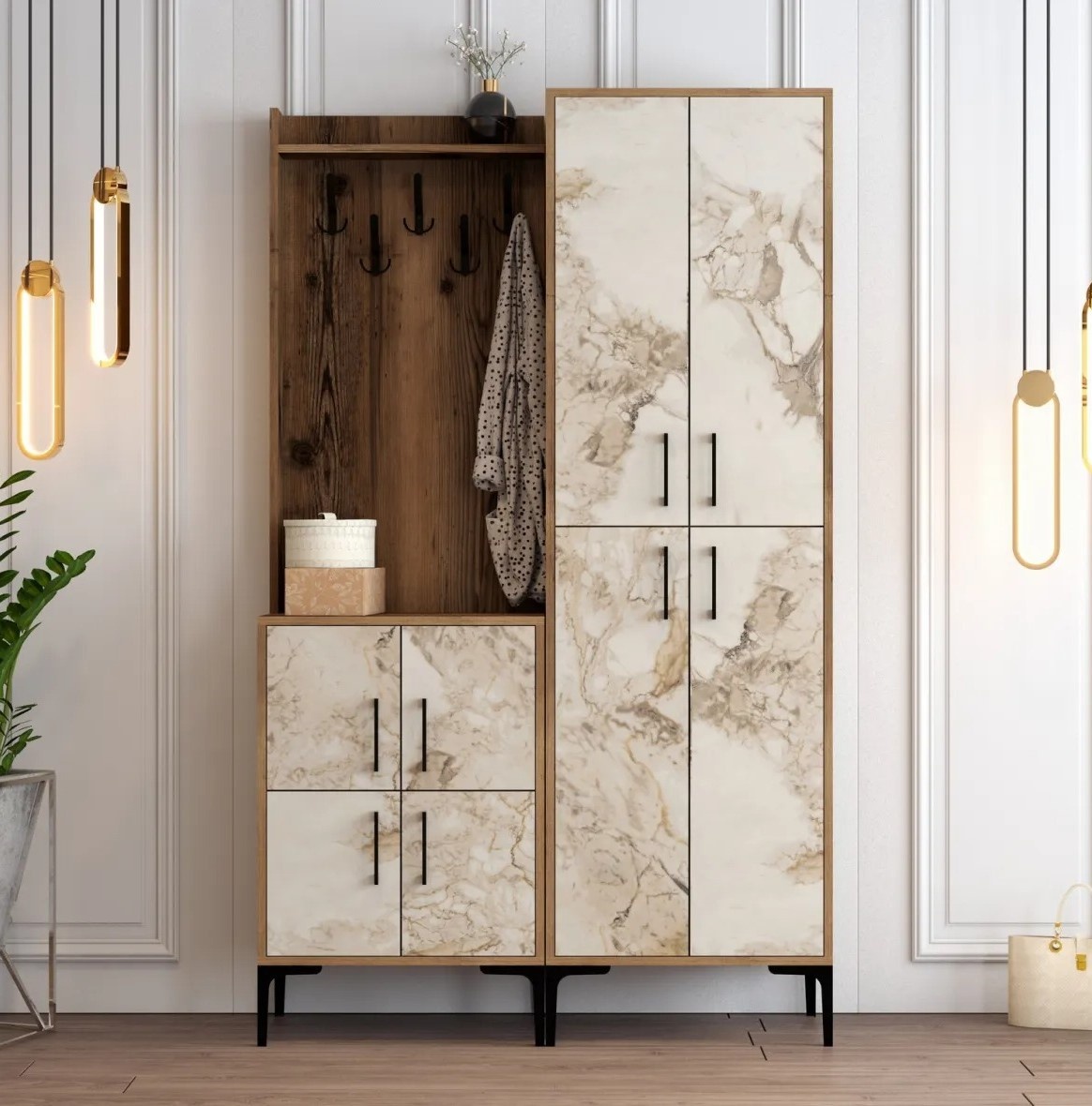Spuneți adio intrărilor dezordonate și salutați organizarea eficientă. Suportul pentru hol are numeroase rafturi, oferind suficient spațiu pentru paltoane, pălării, genți și alte obiecte esențiale. Totul rămâne la îndemână și aranjat, simplificând rutina zilnică.