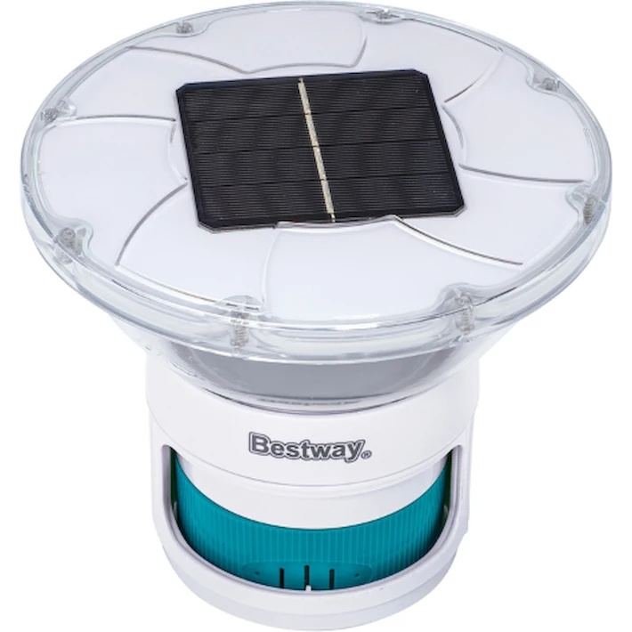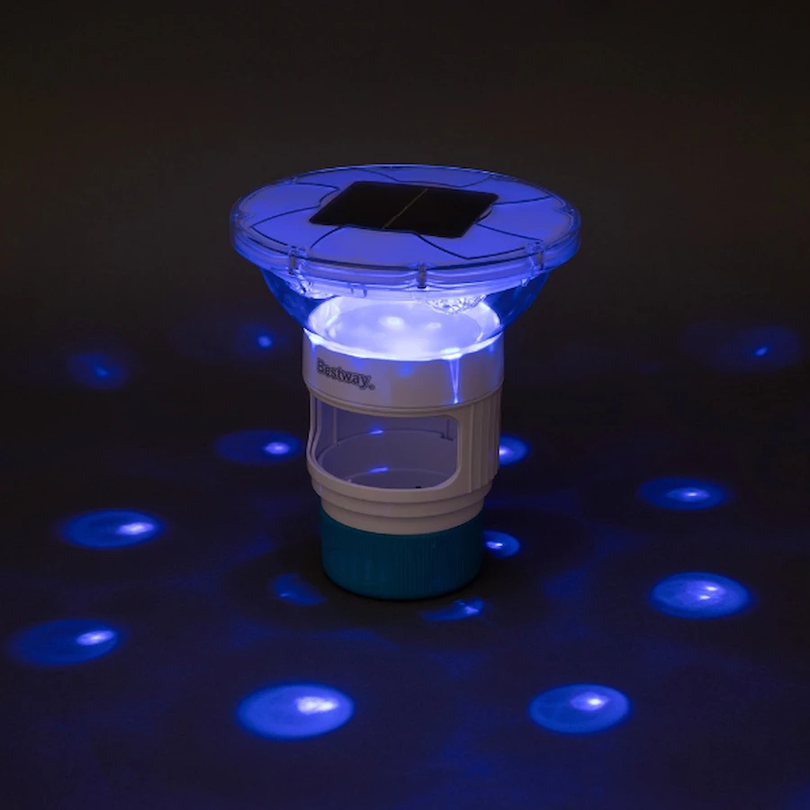С dozatorul flotant SolarGlow™ de la Bestway, veți putea savura combinația perfectă între îngrijirea inteligentă a apei și iluminatul ambiental! Acest dispozitiv servește ca un dozator practic pentru tablete de brom și clor, creând în același timp efecte de lumină frumoase. Bateria solară încorporată acumulează energia soarelui pe parcursul zilei; la lăsarea serii, senzorul de lumină activează automat LED-urile colorate, scufundând piscina dumneavoastră într-o strălucire magică timp de până la opt ore.