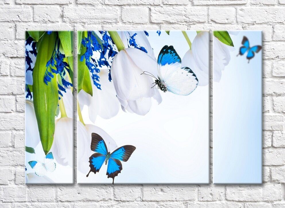 Pictură ArtPoster Butterflies and a bouquet with White tulips and Blue flowers (500056)
