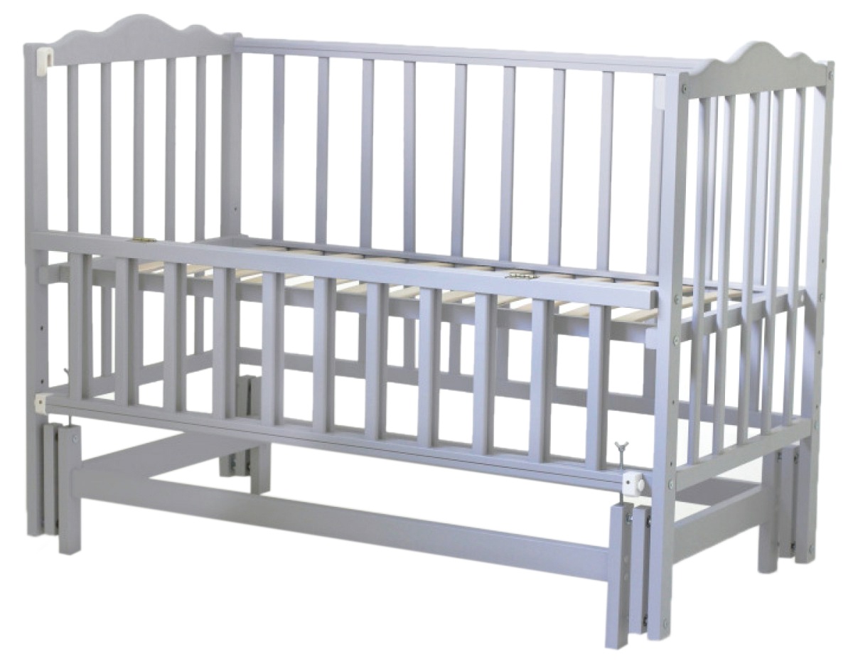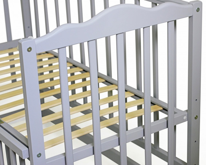 Pătuț pentru copii din lemn natural. Lamele de fag garantează poziția corectă a coloanei vertebrale a copilului. Mecanismul leagăn este fabricat din material sigur.
