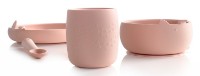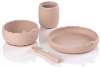 Set distractiv, practic și complet. Lingura are un design ergonomic, iar ceașca este anti-alunecare pentru a se adapta mâinilor bebelușului și a-l ajuta să învețe. În plus, atât bolul cât și farfuria au ventuze puternice care aderă la suprafață pentru o mai mare siguranță și confort.