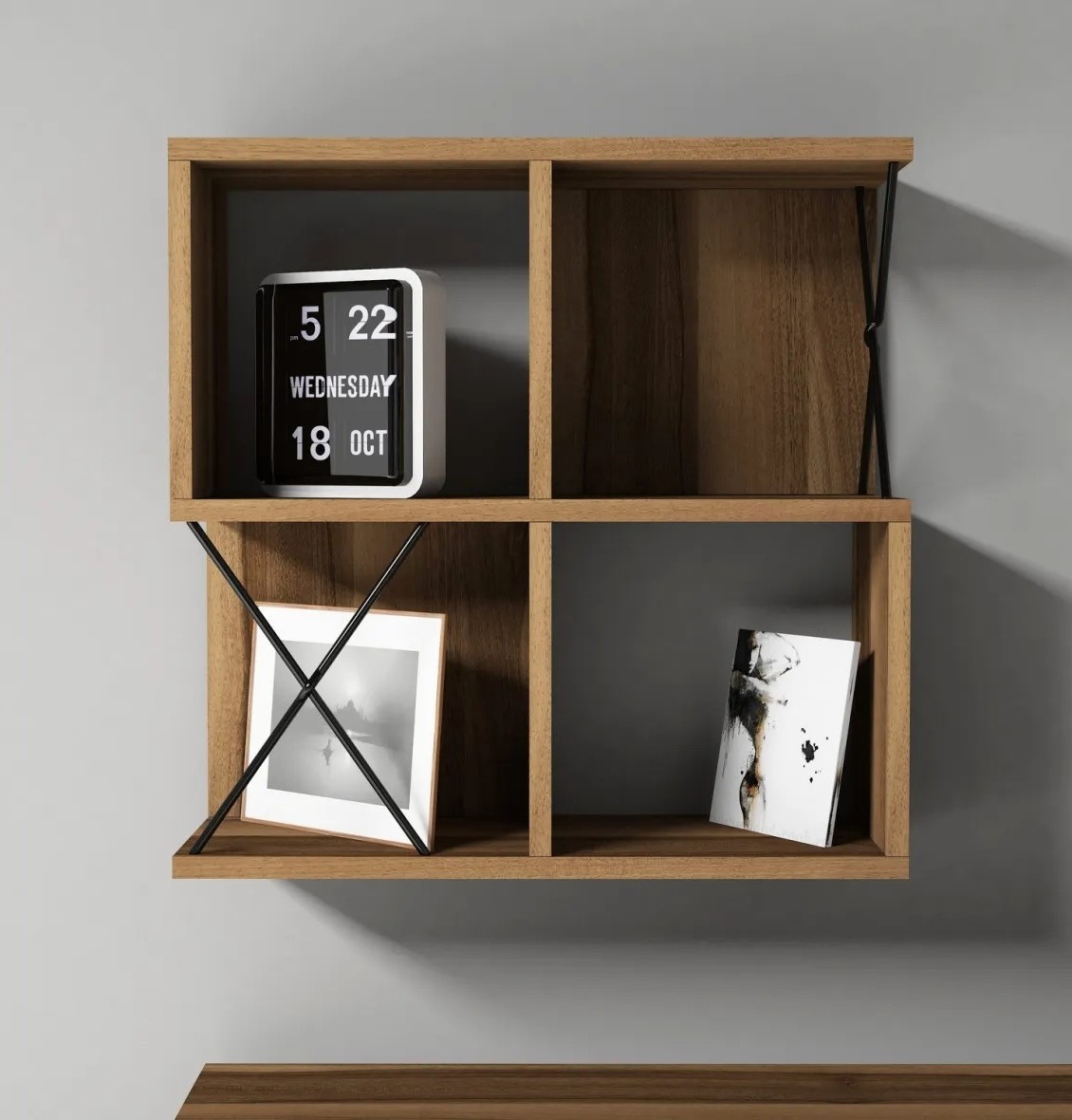 Raftul poate fi montat cu ușurință pe perete, optimizând spațiul de pe podea. Indiferent dacă este folosit pentru a crea un punct focal în camera de zi sau pentru a adăuga o soluție practică în dormitor, reprezintă o alegere excelentă.