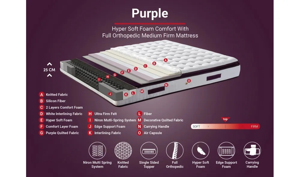 Salteaua Niron Purple, cu sistemul său multi-arc Niron, oferă un suport ideal pentru zona lombară, gât și coloană vertebrală datorită pernei sale voluminoase și ultra-moi, creând o senzație de somn odihnitor.