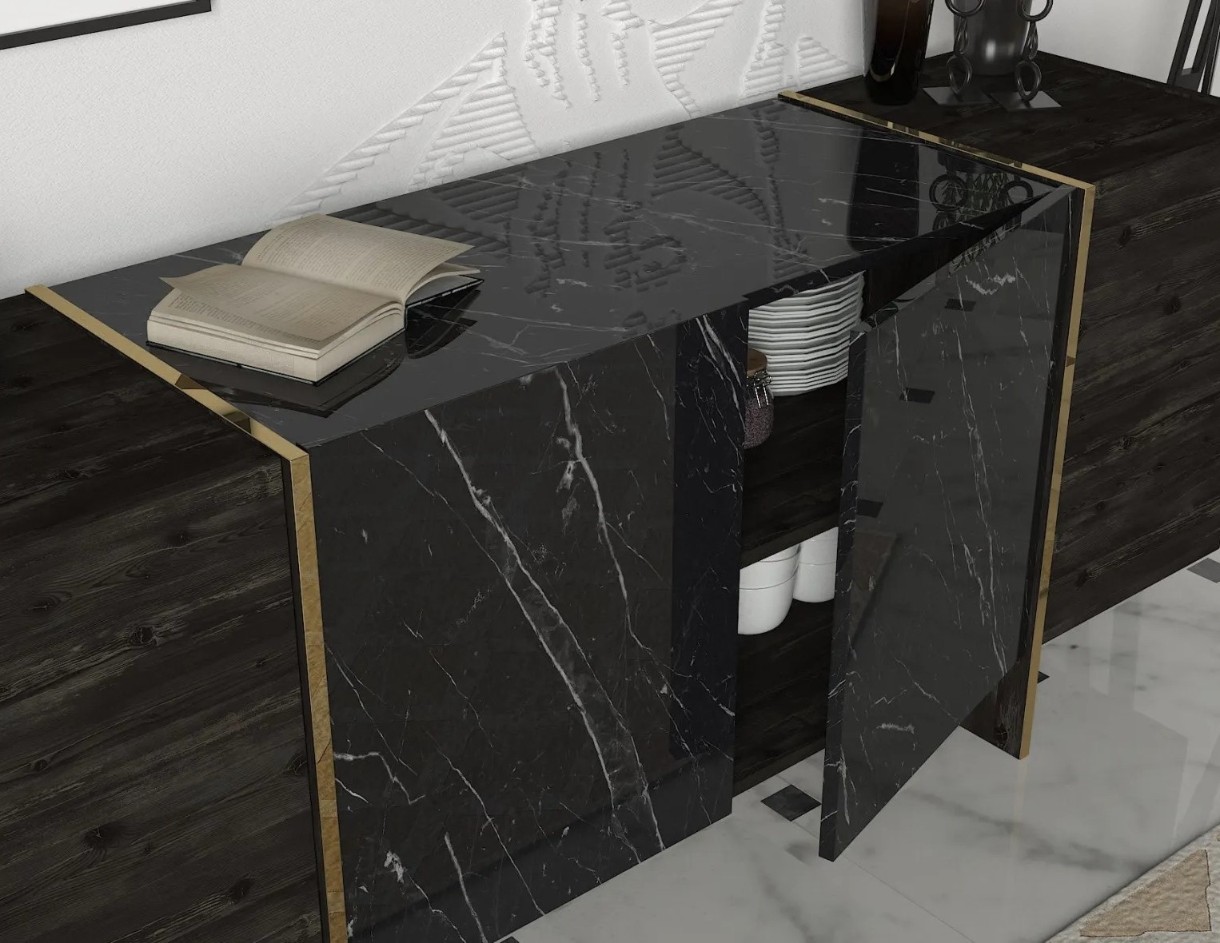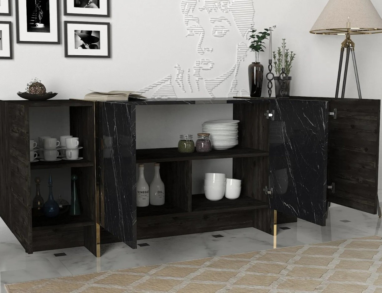 Consola este proiectata cu o combinatie izbitoare de culori negru si auriu, adaugand o nota de eleganta si opulenta oricarei Incaperi. Culorile contrastante creeaza o piesa atragatoare din punct de vedere vizual si atragatoare, care va va impresiona cu siguranta oaspetii.