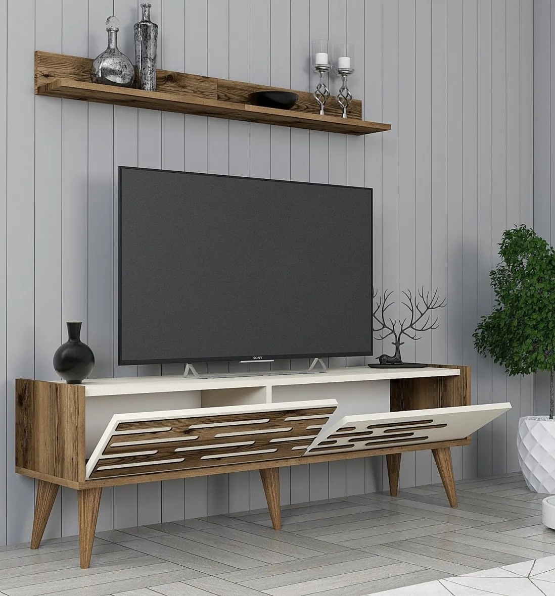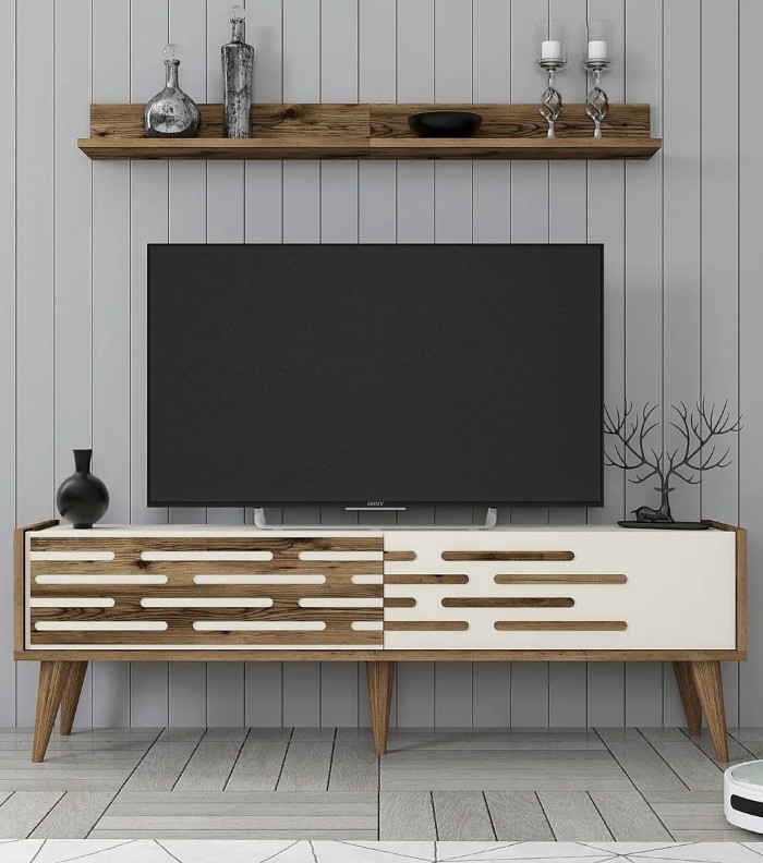 Unitatea TV cu dimensiuni de 140 cm lățime, 35 cm înălțime și 45 cm adâncime permite plasarea televizorului și a altor dispozitive media. Raftul de perete de 120 cm lățime, 16 cm înălțime și 11,8 cm adâncime oferă spațiu suplimentar pentru obiecte decorative, cărți sau DVD-uri.