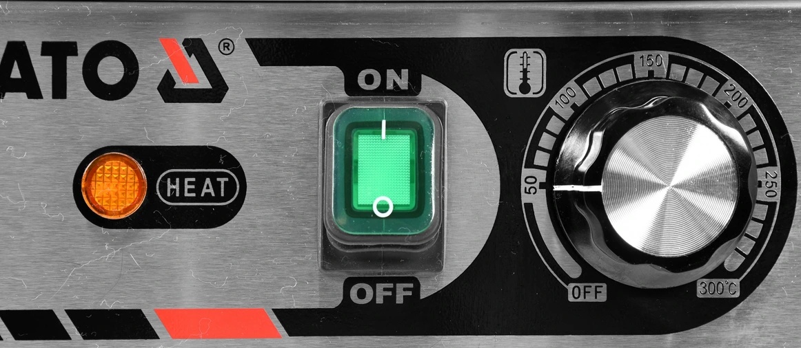 Încălzitorul de 2,2kW este controlat de un potențiometru situat pe panoul frontal. Este posibil să setați temperatura de lucru în intervalul 50 ~ 300 ℃ . Un comutator anti-stropire instalat vă permite să opriți grătarul atunci când nu este utilizat, fără a fi necesar să deconectați cablul de alimentare de la rețea. Gratarul este alimentat de 230V ~ 50Hz.