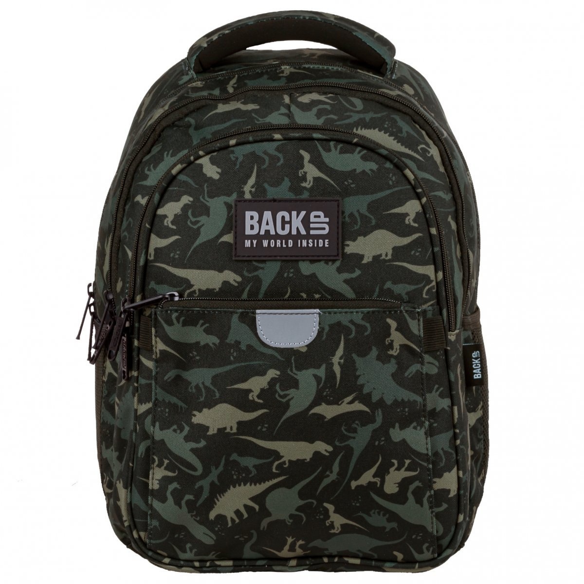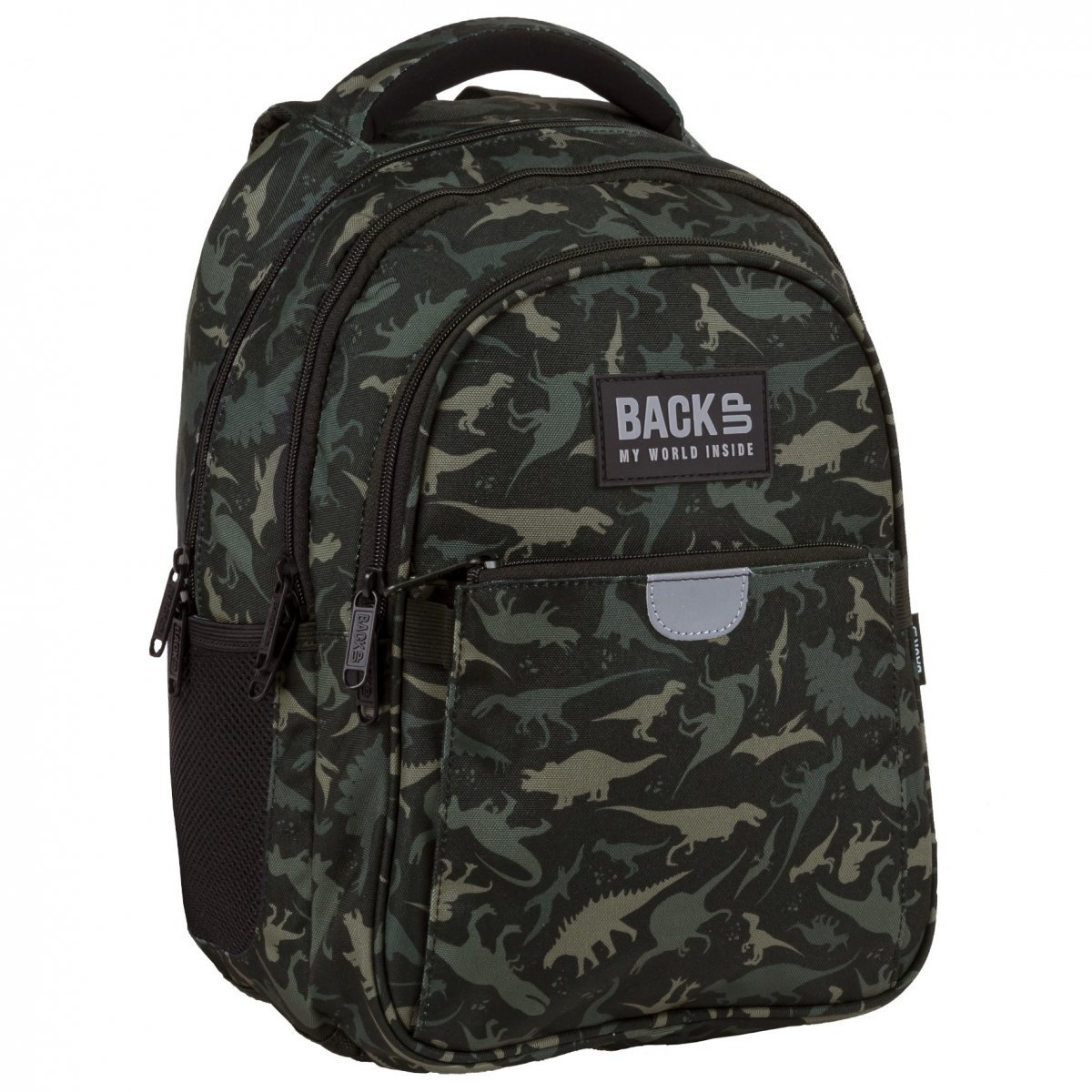 Un rucsac de școală încăpător și funcțional va atrage toată lumea. Rucsacul se caracterizează printr-o manoperă atentă și un model grozav cu un motiv de dinozaur. Materialul din care este cusut rucsacul este rezistent la apa si durabil. Rucsacul este incapator, are 3 compartimente mari si un mic buzunar frontal. Într-una dintre camere există două buzunare suplimentare; a doua cameră încăpătoare găzduiește cu ușurință și formatul A4; al treilea are un organizator la îndemână cu carabină. Pe laterale, rucsacul are două buzunare deschise pentru o sticlă de apă sau o sticlă de apă. Toate fermoarele sunt finisate cu extractoare mari la îndemână. Spatele rucsacului este bine rigidizat și acoperit cu un material respirabil. Bretelele de umăr sunt largi, căptușite moale și acoperite cu un material respirabil pe partea inferioară. Partea inferioară a rucsacului este întărită cu spumă. În partea de sus, rucsacul are un mâner de transport căptușit ușor și unul suplimentar pentru agățat. Are reflectoare discrete care vor asigura siguranta pe drum. Buzunarul frontal întărit cu spumă protejează conținutul de deteriorare.