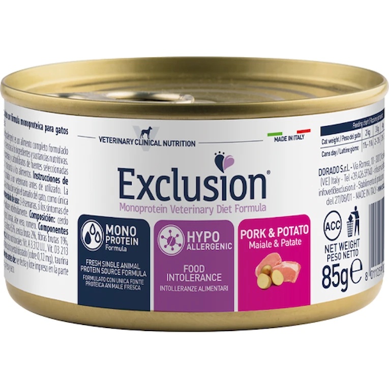 Hrană umedă pentru pisici Exclusion Hypoallergenic Adult Cats Pork & Potato 85g