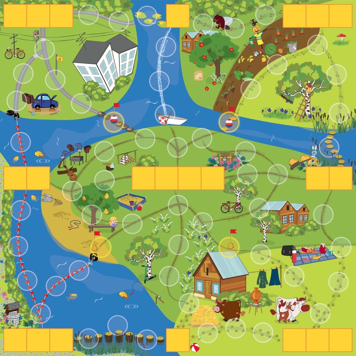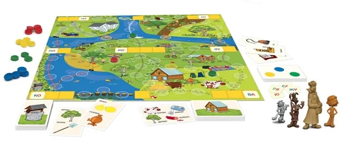 In setcărți de joc - 64 buc., jetoane multicolore - 19 buc., jetoane de jucător - 4 buc., jetoane de hârtie de litere și silabe - 127 buc., loc de joaca
